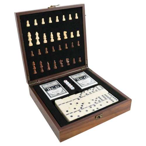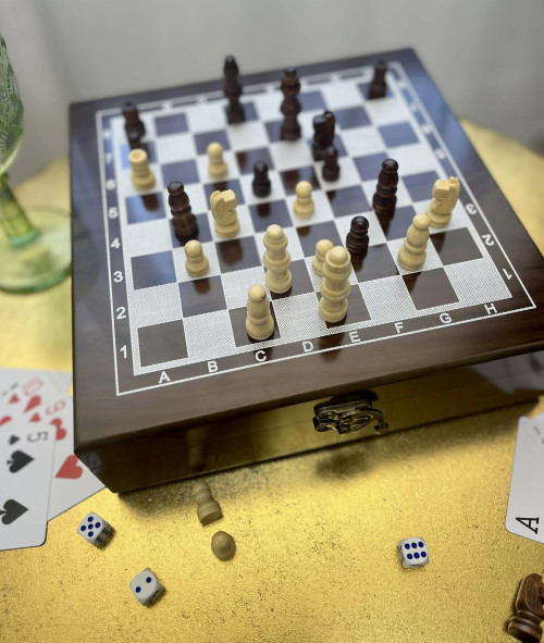 This compact games set is everything in one - Chess, Cards, and Dominoes. Each set is housed in a sleek wooden box with a white chessboard printed on the lid, giving it a sharp look when left out on a coffee table or shelf. The whole thing packs away neatly and has a brass latch at the front to keep everything in place. It's just nice to have everything in one place and this set does it without looking out of place with other homeware and decorations.