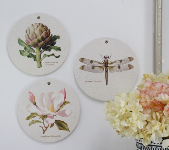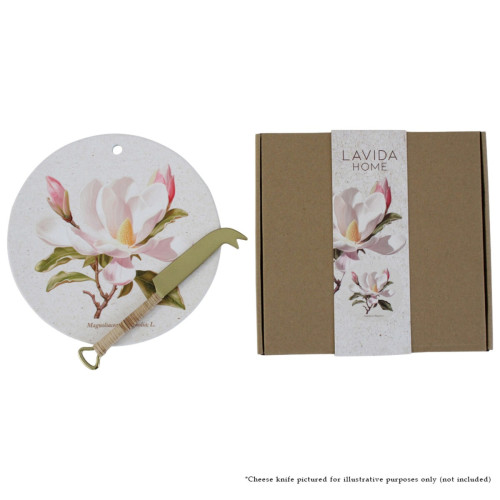 We love how the delicate magnolia illustration pops against the neutral ceramic base - it works beautifully as both a decorative plaque and a functional trivet.